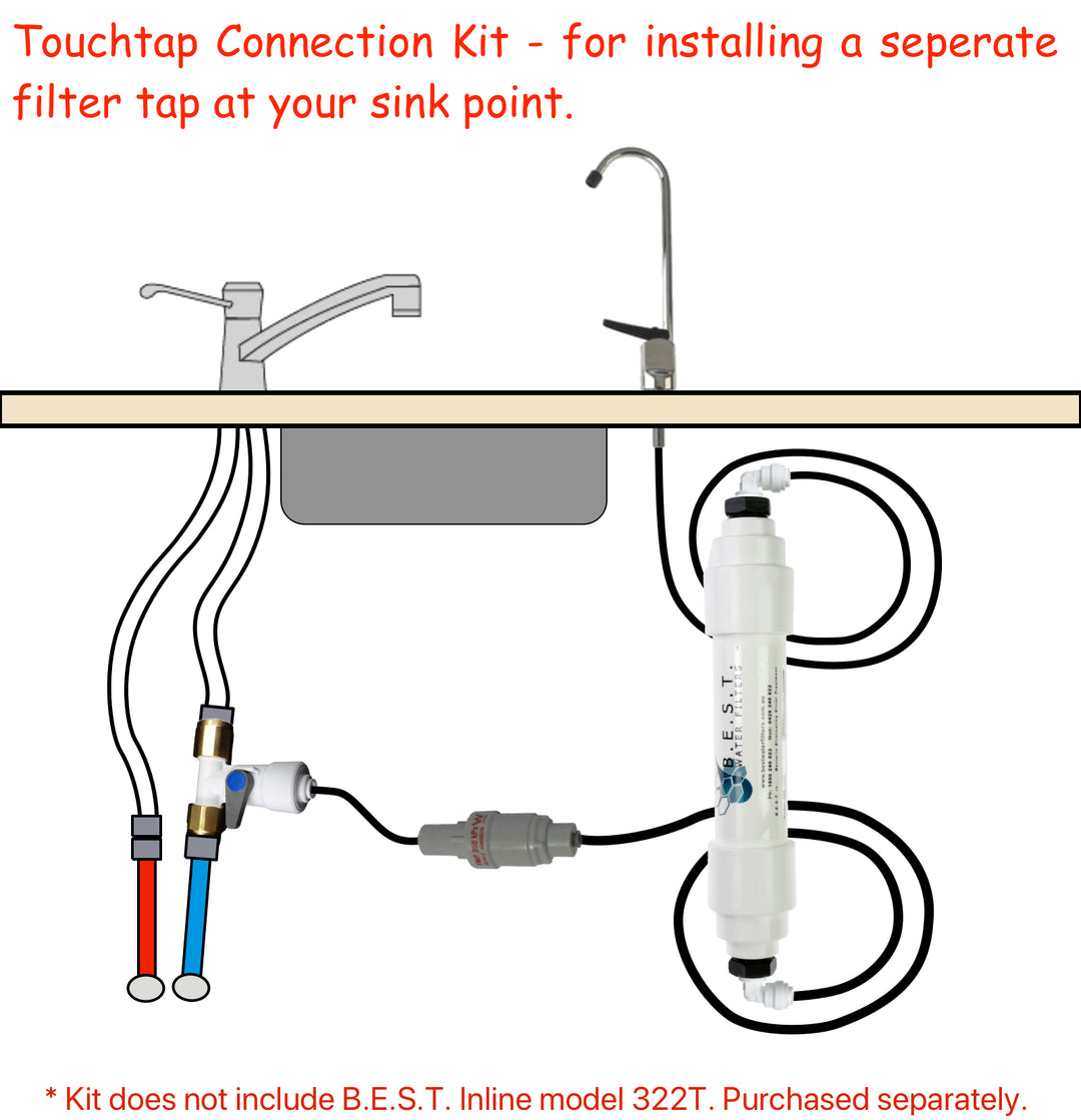 Do you prefer to have a separate tap for your drinking water? This Touchtap Connection Kit gives you all the fittings required to create a water connection from your B.E.S.T. Inline (not included) to your sink top.
